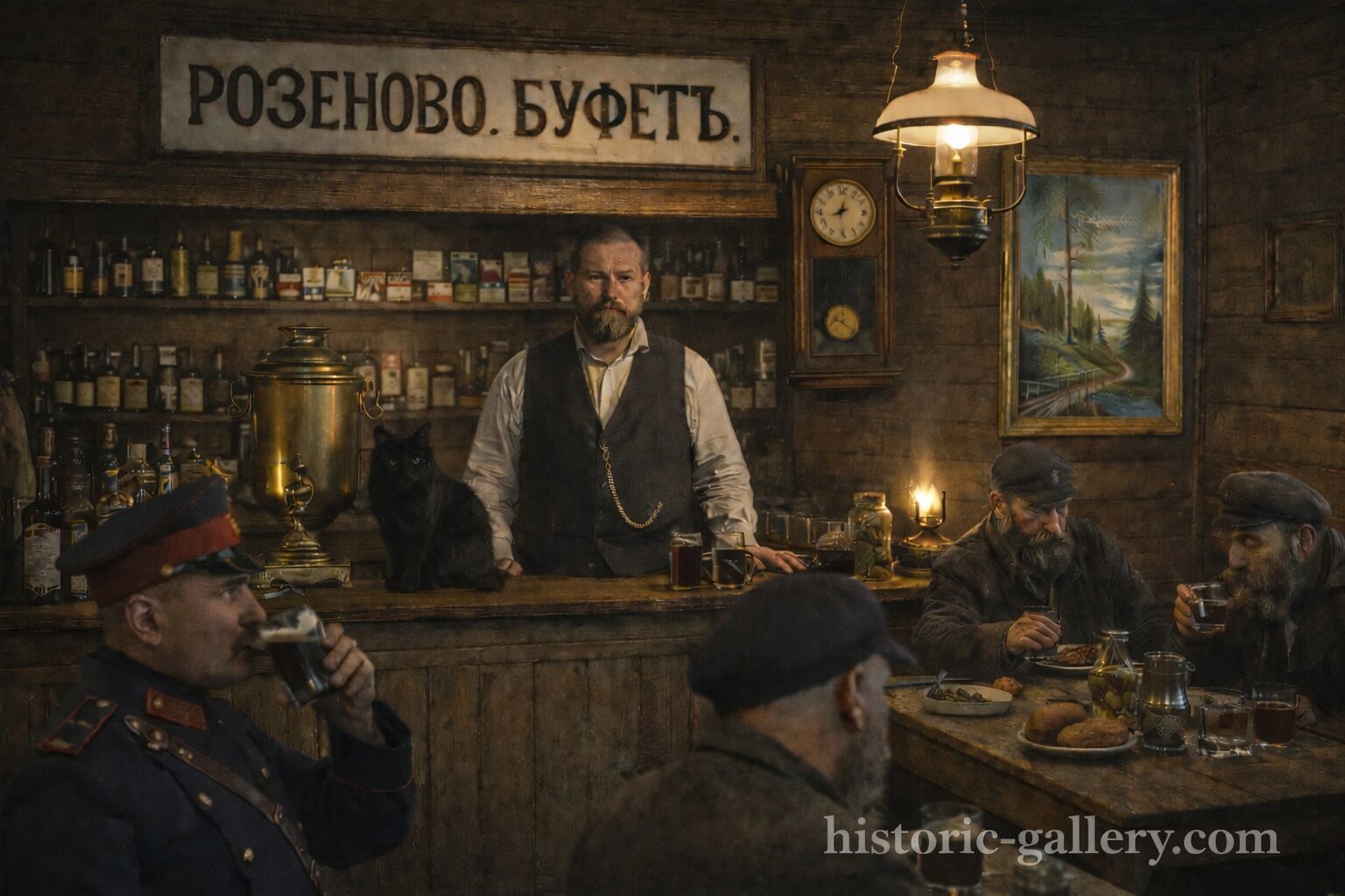 Stacijas Rozenova bufete. 1900 - tie gadi. Rekonstruēta ar MI palīdzību. -